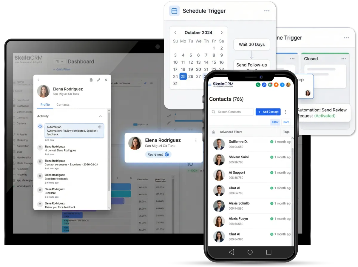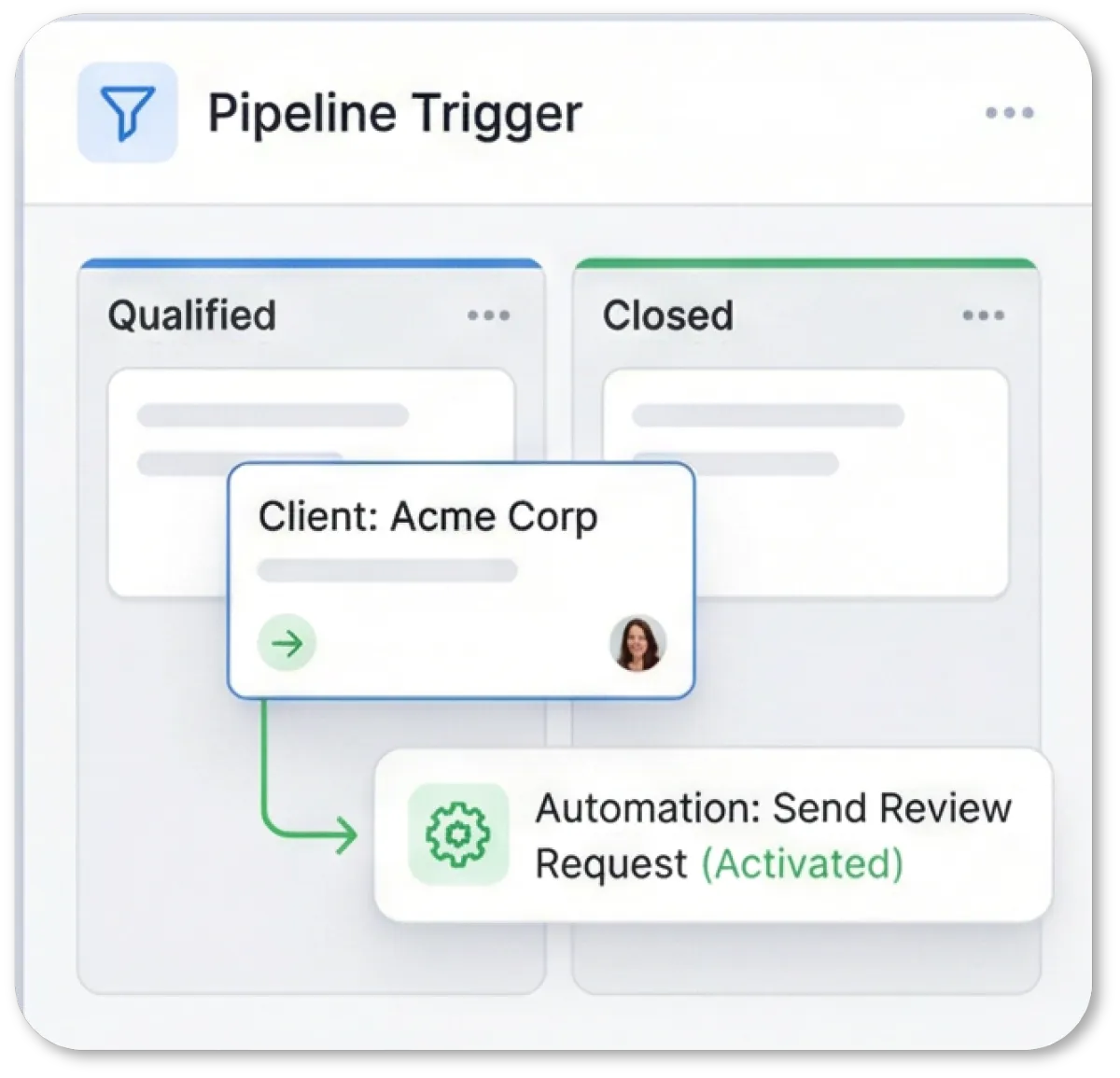Automatización completa: respuestas, seguimientos, recordatorios y solicitudes de reviews se envían en el momento justo sin trabajo manual.