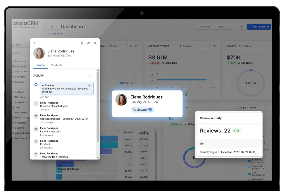 Cada reseña queda registrada en el CRM para seguimiento, control y reportes internos.