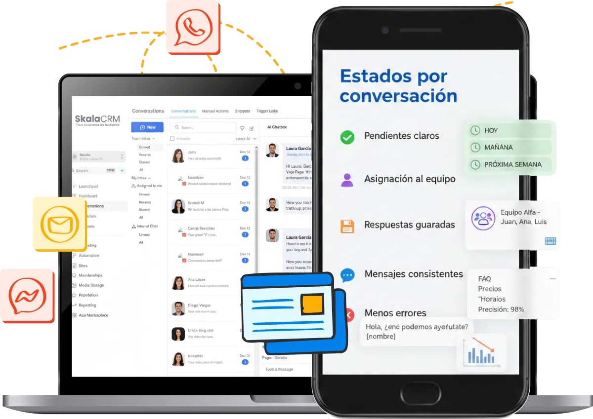 Mensajes, consultas y leads en un inbox único. Sin saltar entre apps.
