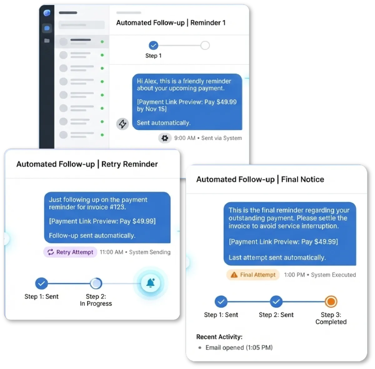 El sistema envía recordatorios de pago en el momento justo para cobrar sin persecución manual.